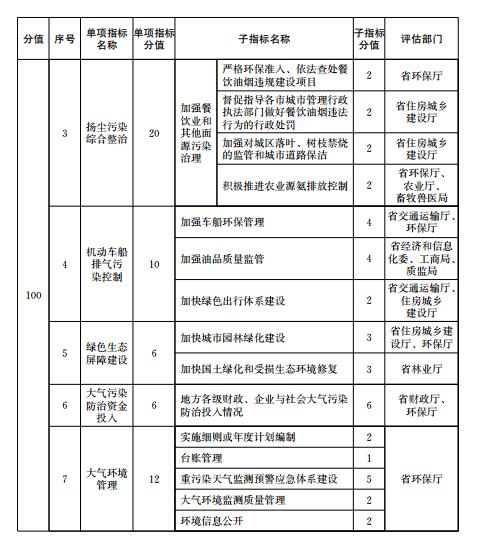 大氣污染防治重點(diǎn)任務(wù)完成情況包括能源和產(chǎn)業(yè)結(jié)構(gòu)調(diào)整、工業(yè)污染綜合治理、揚(yáng)塵污染綜合整治、機(jī)動(dòng)車船排氣污染控制、綠色生態(tài)屏障建設(shè)、大氣污染防治資金投入、大氣環(huán)境管理等7項(xiàng)指標(biāo)。大氣污染防治重點(diǎn)任務(wù)完成情況各指標(biāo)的定義、評估要求和計(jì)分方法等由有關(guān)評估部門按照《二期行動(dòng)計(jì)劃》的職責(zé)分工確定,評估部門根據(jù)子指標(biāo)分值對各市重點(diǎn)任務(wù)進(jìn)行打分,并向省環(huán)保廳提供評分結(jié)果。評估部門為兩個(gè)部門以上的,各評估部門分別打分后取平均值作為本項(xiàng)重點(diǎn)任務(wù)得分。