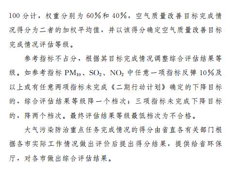 第四條評估采用評分法,空氣質(zhì)量改善目標(biāo)完成情況和大氣污染防治重點(diǎn)任務(wù)完成情況滿分均按滿分100分計(jì),綜合評估結(jié)果為二者的加權(quán)平均值,權(quán)重分別為60%和40%。評估結(jié)果分為優(yōu)秀、良好、合格、不合格四個(gè)等級,其中,評分結(jié)果90分及以上為優(yōu)秀、70分(含)至90分為良好、60分(含)至70分為合格、60分以下為不合格。根據(jù)參考指標(biāo)目標(biāo)完成情況調(diào)整綜合評估結(jié)果等級作為最終評估結(jié)果。參考指標(biāo)PM10、SO2、NO2中任意一項(xiàng)指標(biāo)反彈10%及以上或有任意兩項(xiàng)指標(biāo)未完成《二期行動(dòng)計(jì)劃》確定的下降目標(biāo)的,綜合評估結(jié)果等級降一個(gè)檔次;三項(xiàng)指標(biāo)未完成下降目標(biāo)的,降兩個(gè)檔次。最終評估結(jié)果等級最低檔次為不合格。