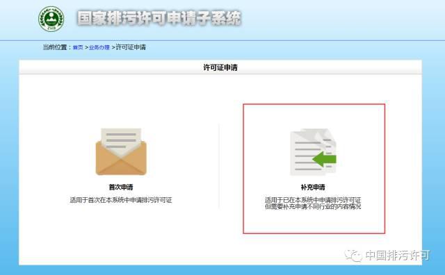 正確的操作是——進入“國家排污許可證信息公開系統(tǒng)”的“申請子系統(tǒng)”(http://permit.mep.gov.cn/permitExt/outside/LicenseRedirect),進行“補充申請”。