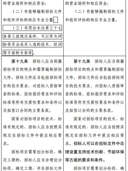 在對招標(biāo)法第19條的修改中,在保留原有“國家對招標(biāo)項目的技術(shù)、標(biāo)準有規(guī)定的,招標(biāo)人應(yīng)當(dāng)按照其規(guī)定在招標(biāo)文件中提出相應(yīng)要求”內(nèi)容的基礎(chǔ)上,增加了“招標(biāo)人可以在招標(biāo)文件中合理設(shè)置支持技術(shù)創(chuàng)新、節(jié)能環(huán)保等方面的要求和條件”的內(nèi)容,加重了創(chuàng)新和節(jié)能環(huán)保在招投標(biāo)中的考量力度。