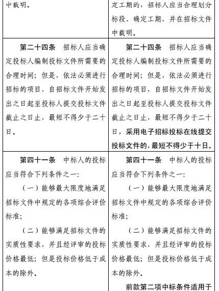五、將第二十四條修改為:“招標(biāo)人應(yīng)當(dāng)確定投標(biāo)人編制投標(biāo)文件所需要的合理時間;但是,依法必須進行招標(biāo)的項目,自招標(biāo)文件開始發(fā)出之日起至投標(biāo)人提交投標(biāo)文件截止之日止,最短不得少于二十日,采用電子招標(biāo)投標(biāo)在線提交投標(biāo)文件的,最短不得少于十日?!?/p>