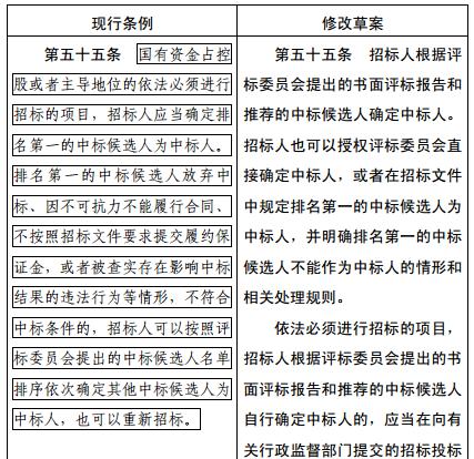 一、將第五十五條修改為:“招標(biāo)人根據(jù)評標(biāo)委員會提出的書面評標(biāo)報告和推薦的中標(biāo)候選人確定中標(biāo)人。招標(biāo)人也可以授權(quán)評標(biāo)委員會直接確定中標(biāo)人,或者在招標(biāo)文件中規(guī)定排名第一的中標(biāo)候選人為中標(biāo)人,并明確排名第一的中標(biāo)候選人不能作為中標(biāo)人的情形和相關(guān)處理規(guī)則。