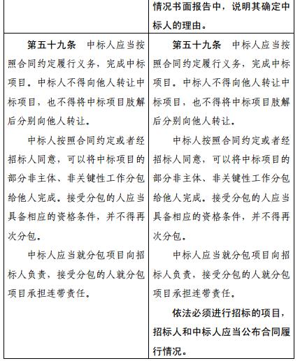 二、第五十九條增加一款,作為第四款:“依法必須進行招標(biāo)的項目,招標(biāo)人和中標(biāo)人應(yīng)當(dāng)公布合同履行情況?!?/p>