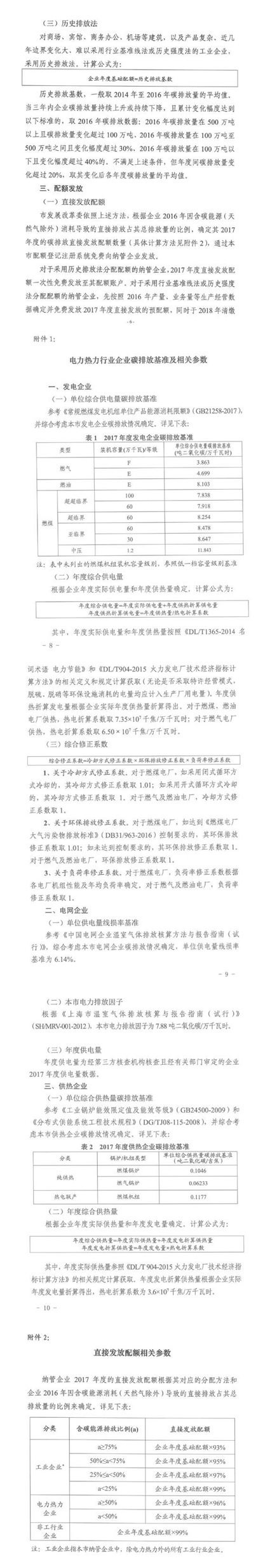 近日,上海市發(fā)改 委印發(fā)了《上海市2017年碳排放配額分配方案》, 方案中確定了上海市2017度碳排放交易體系配額總量為1.56億噸(含直接發(fā)放配額和儲(chǔ)備配額)。上海市采取行業(yè)基準(zhǔn)線(xiàn)法、歷史強(qiáng)度法和歷史排放法確定納管企業(yè)2017年度基礎(chǔ)配額。在具備條件的情況下,優(yōu)先采用行業(yè)基準(zhǔn)線(xiàn)法和歷史強(qiáng)度法等基于排放效率的分配方法。發(fā)電企業(yè):根據(jù)不同類(lèi)型發(fā)電機(jī)組的單位綜合供電量碳排放基準(zhǔn)、年度綜合供電量以及綜合修正系數(shù),確定企業(yè)年度基礎(chǔ)配額。電網(wǎng)企業(yè):根據(jù)單位供電量線(xiàn)損率基準(zhǔn)、年度供電量以及電子排放因子,確定企業(yè)年度基礎(chǔ)配額。