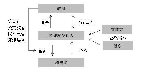 特許經(jīng)營權允許社會資本運營商(受讓人)在指定區(qū)域內負資全商提供公共服務,包括系統(tǒng)的運營、維護,征收費用,管理,建設和修復等,同時,運營商負責所有資本投資。盡管社會資本運營商負赍提供資產(chǎn),該資產(chǎn)即使在特許期內也屬于政府所有。政府負確定實施標準,并確保受讓人能達到標準。從本質 上講,待許經(jīng)營模式將政府的角色從服務提供者轉變?yōu)榉諆r格和質量的規(guī)范者。