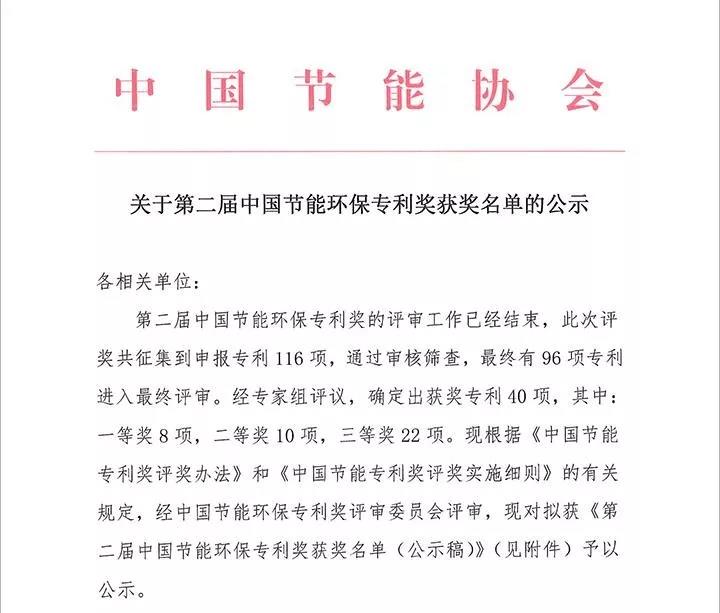 近期,中國節(jié)能協(xié)會(huì)公布了第二屆中國節(jié)能環(huán)保專利獎(jiǎng)獲獎(jiǎng)名單。
