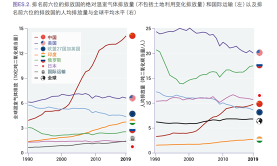 可以看出來,就排放總量而言,2019年中國已經(jīng)遠遠的超過了其他國家,甚至已經(jīng)是美國的2倍了,中國的碳排放差不多140億噸二氧化碳當(dāng)量,