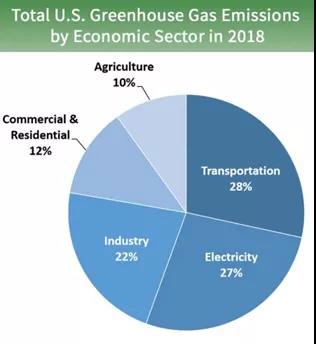 看美國2018年的數(shù)據(jù)也是類似的,交通(28%),發(fā)電(27%),工業(yè)(22%),建筑(12%)