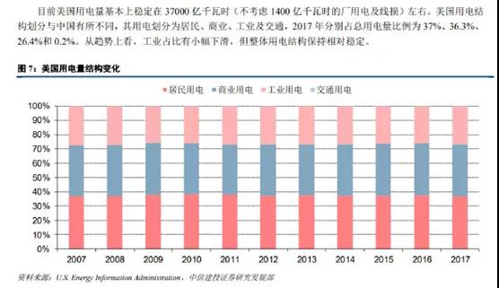 而美國則是居民和商業(yè)用電合計超過了70%,工業(yè)用電不到30%。