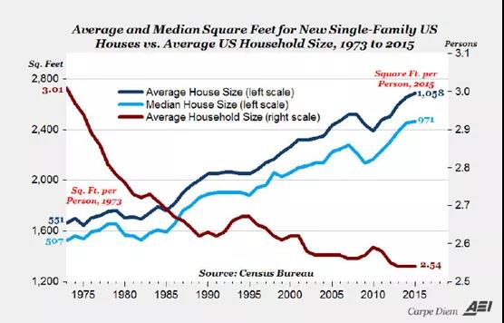 當(dāng)然了,國內(nèi)家庭各種家用電器也不少,怎么會跟美利堅老百姓有這么大的差距呢?首先我們的城市化水平還不如美國,還有幾億人住在農(nóng)村。其次美國的人均住房面積大,比歐洲和中國都大不少,會帶來對空調(diào),燈具和其他家電的使用也更為奢侈,下圖是美國的2015年新建的獨棟房屋的人均住房面積達到了1038平方英尺,超過96平米了,注意這可是人均啊,怪不得國內(nèi)中產(chǎn)和土豪都喜歡去北美買大house。