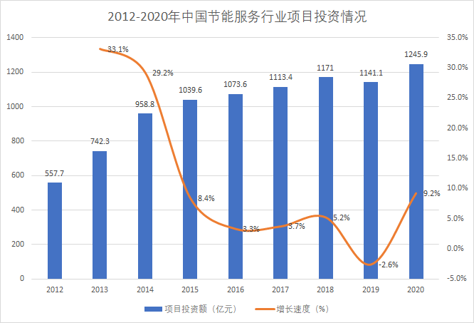 近年來,中國節(jié)能服務(wù)能效項目穩(wěn)健開展,2020年,節(jié)能服務(wù)行業(yè)項目投資額約為1245.9億元,同比上漲9.2%。