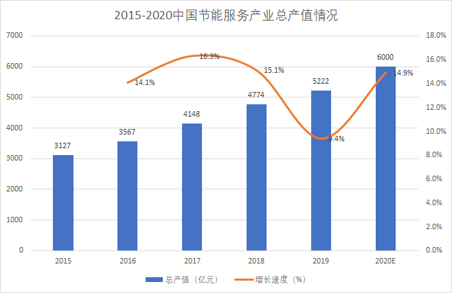 近年來,節(jié)能服務(wù)產(chǎn)業(yè)總產(chǎn)值不斷增長,呈逐年上漲趨勢。中國節(jié)能協(xié)會數(shù)據(jù)顯示,2019年我國節(jié)能服務(wù)產(chǎn)業(yè)總產(chǎn)值達5222億元,同比增長9.38%。根據(jù)《“十三五”節(jié)能環(huán)保產(chǎn)業(yè)發(fā)展規(guī)劃》,到2020年節(jié)能服務(wù)業(yè)總產(chǎn)值達到6000億元。我國節(jié)能服務(wù)行業(yè)潛力巨大。