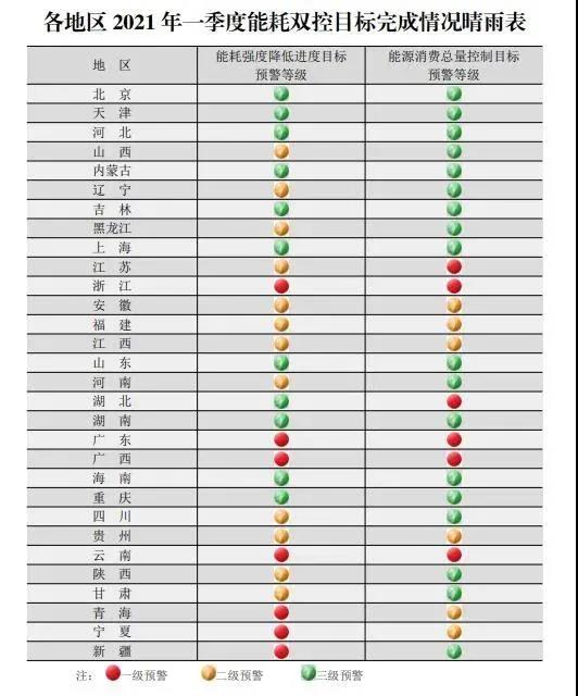 為貫徹落實(shí)黨中央、國(guó)務(wù)院關(guān)于強(qiáng)化能源消費(fèi)總量和強(qiáng)度雙控的決策部署,加強(qiáng)能耗雙控形勢(shì)分析預(yù)警,國(guó)家發(fā)展改革研究提出了《各地區(qū)2021年一季度能耗雙控目標(biāo)完成情況晴雨表》。