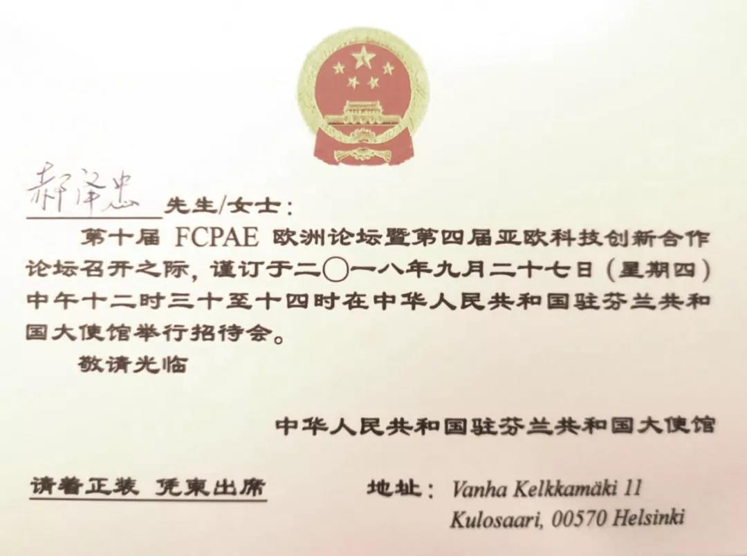 全球公益系列活動(dòng)在芬蘭傳遞期間正值第十屆FCPAE歐洲論壇暨第四屆亞歐科技創(chuàng)新合作論壇在芬蘭赫爾辛基召開,倡導(dǎo)環(huán)保節(jié)能低碳的公益活動(dòng)得到了論壇舉辦方以及中國(guó)駐芬蘭大使館的廣泛關(guān)注和大力支持,以中科宇杰董事長(zhǎng)郝澤忠為代表的宣傳團(tuán)一行受邀出席中國(guó)駐芬蘭大使館招待會(huì)。